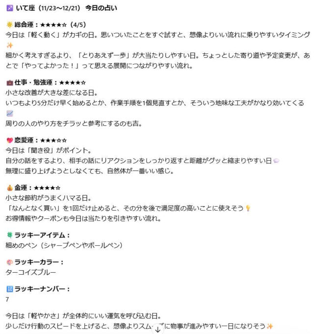 項目の追加もできて、「テスト運入れて」「部活運も」「今日の出向先運は」って言えばそのまま反映してくれる。自分専用の占いフォーマットを育てていく感覚に近い。