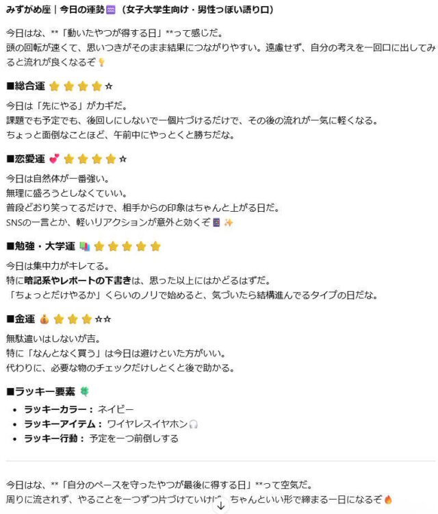 ChatGPTの占い結果(女子大生向け/男性っぽい文体)
