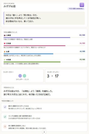 そのままだとChatGPTの様な構図になってしまったので、「ビジュアル的に見やすいスマホ向けの構図」という一文を追加している。「今日の行動ヒント」とかのちょっとしたアドバイスが嬉しい。