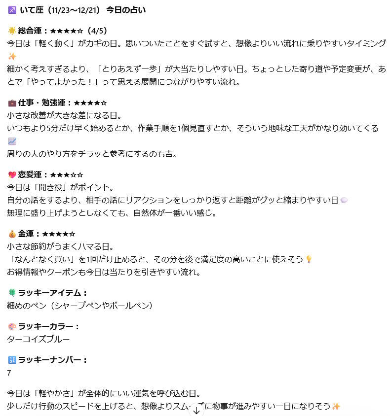 項目の追加もできて、「テスト運入れて」「部活運も」「今日の出向先運は」って言えばそのまま反映してくれる。自分専用の占いフォーマットを育てていく感覚に近い。