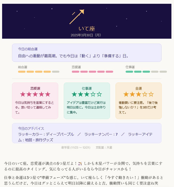 ビジュアル込みで占い結果を自動生成してくれる。星座ごとの背景デザイン、5段階のバーグラフ、恋愛・仕事・金運の3カテゴリカード、ラッキーアイテムまで——指示ゼロでここまでやってくる。