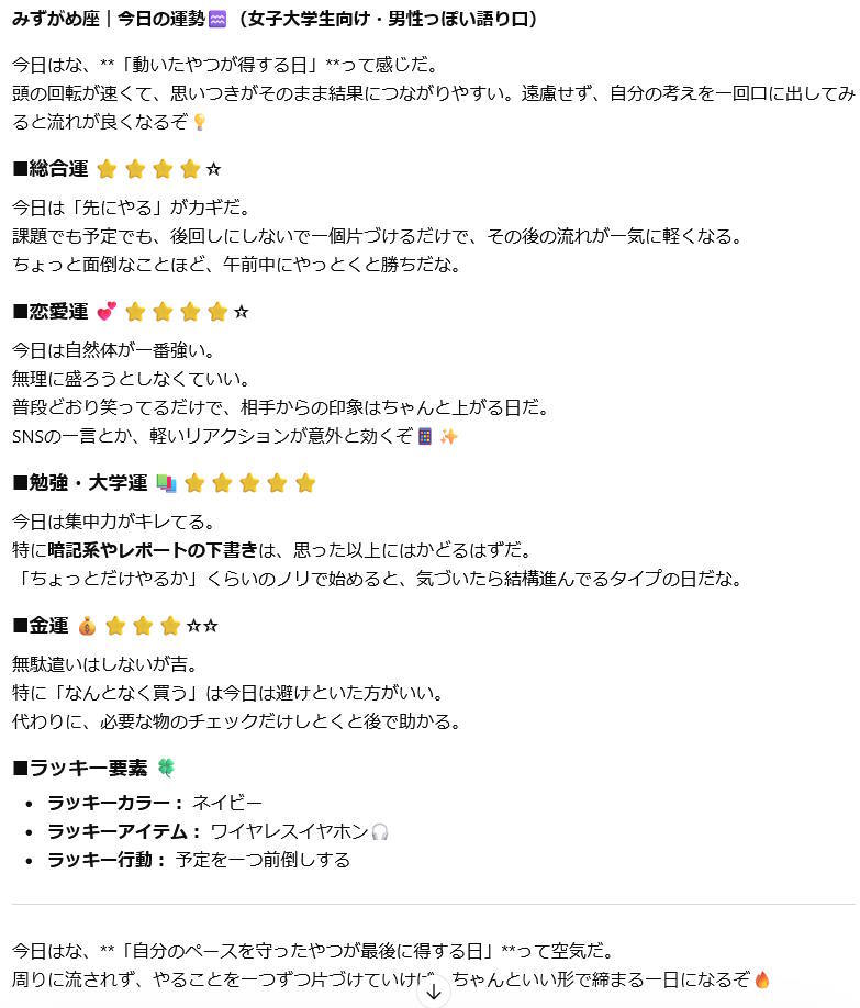 同じ星座・同じ日に聞いても、毎回違う結果が出てくる。AIがその場で生成してるから当然といえば当然。