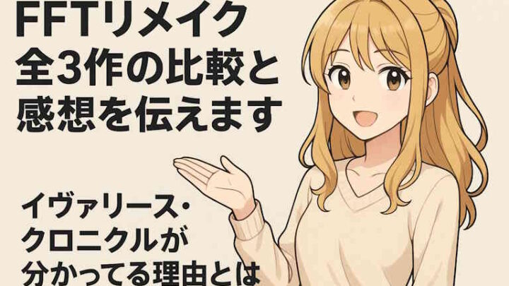 FFシリーズファイナルファンタジータクティクス リメイク全3作の比較と感想を伝えます ファイナルファンタジータクティクスのPS版・獅子戦争(スマホ/PSP)・イヴァリースクロニクルズのリメイク3作の比較と感想を伝えます。フルボイス化の没入感、セリフ変更の違和感、追加要素の有無まで正直レビュー。初見も旧作ファンも後悔しない選び方を解説。 2025.11.26FFシリーズ